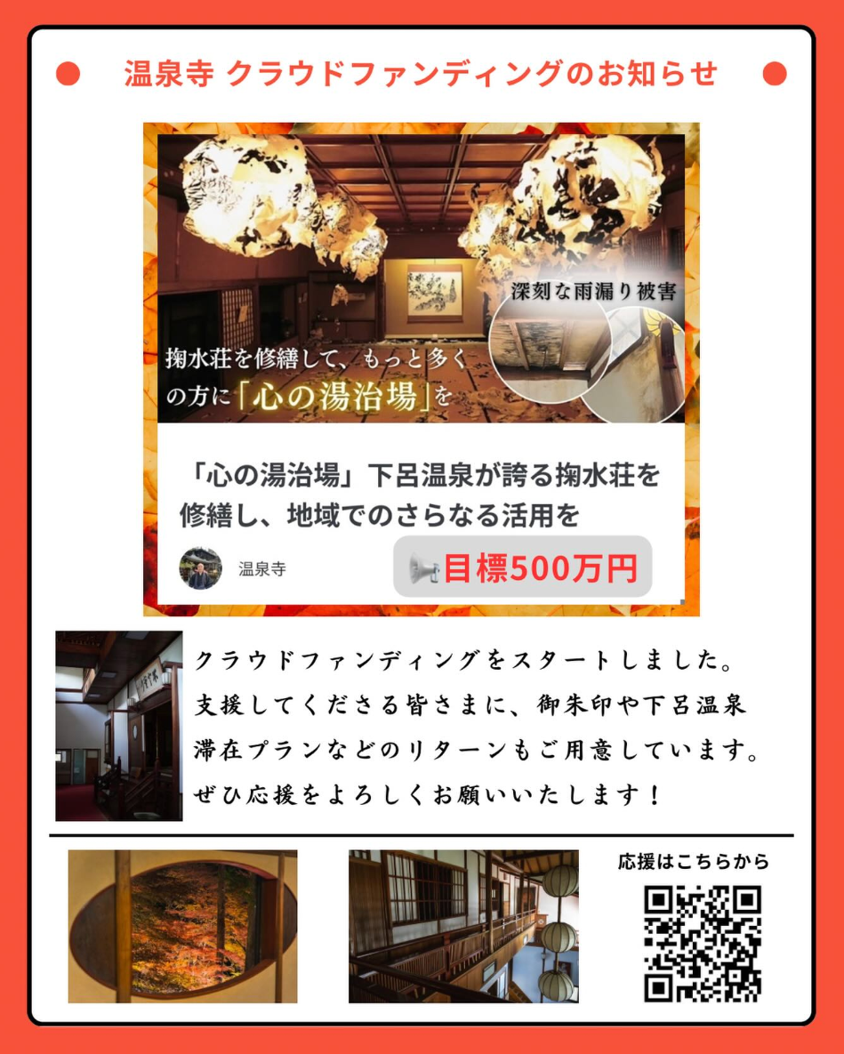 この度は温泉寺の掬水荘雨漏り修繕プロジェクトページをご覧いただき、誠にありがとうございます。掬水荘は「心の湯治場」として温泉寺のためにもお客様のためにも、そしてあらゆるイベント開催を通して出会えるご縁のために、更には下呂温泉の誇る大切な観光資源のために必要な存在です。